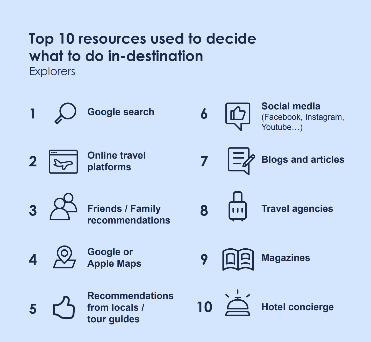 Cet ordre semble s’être modifié ces derniers temps : une majorité de touristes procéderaient aujourd’hui en recherchant en premier lieu les activités et expériences touristiques, cela déterminant alors leur destination, puis le transport, et l’hébergement.