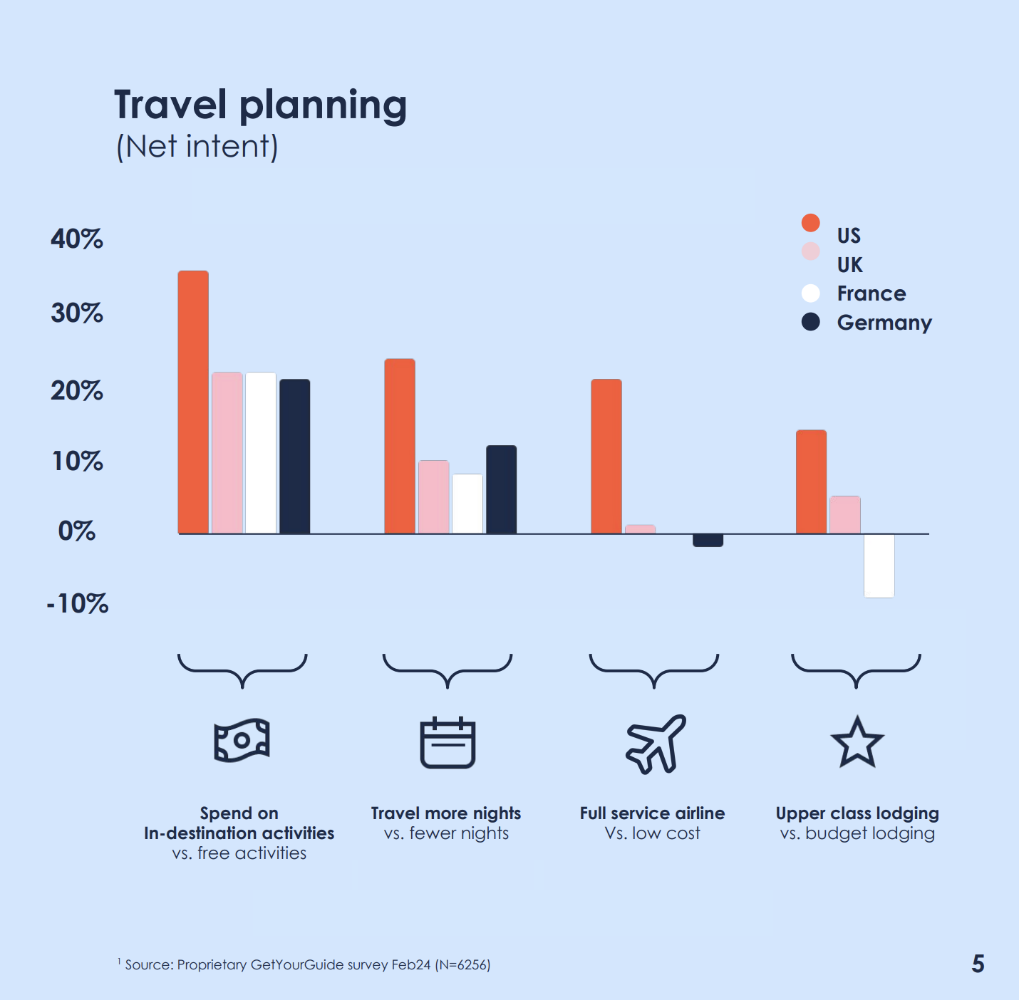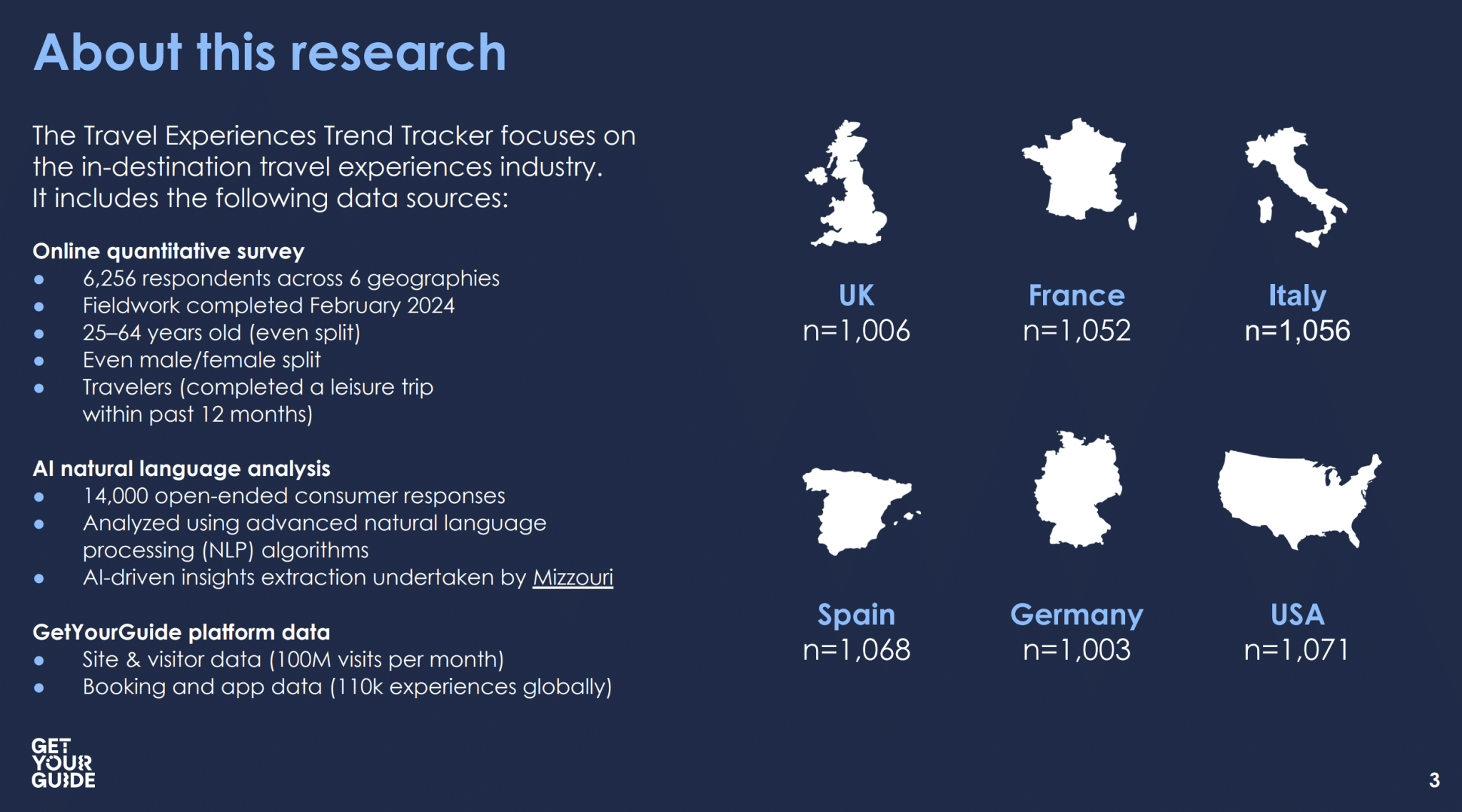 L’étude de GetYourGuide a été réalisée en février 2024 en ligne auprès d’un échantillon de 6000 voyageurs de 25 à 64 ans (6 256 exactement), dans 6 pays. 1000 voyageurs ont été interrogés dans chacun d’entre eux : en France, au Royaume-Uni, en Italie, en Espagne, en Allemagne et aux USA. La notion de voyageur était définie ainsi : une personne ayant effectué au moins un voyage touristique au cours des 12 derniers mois.