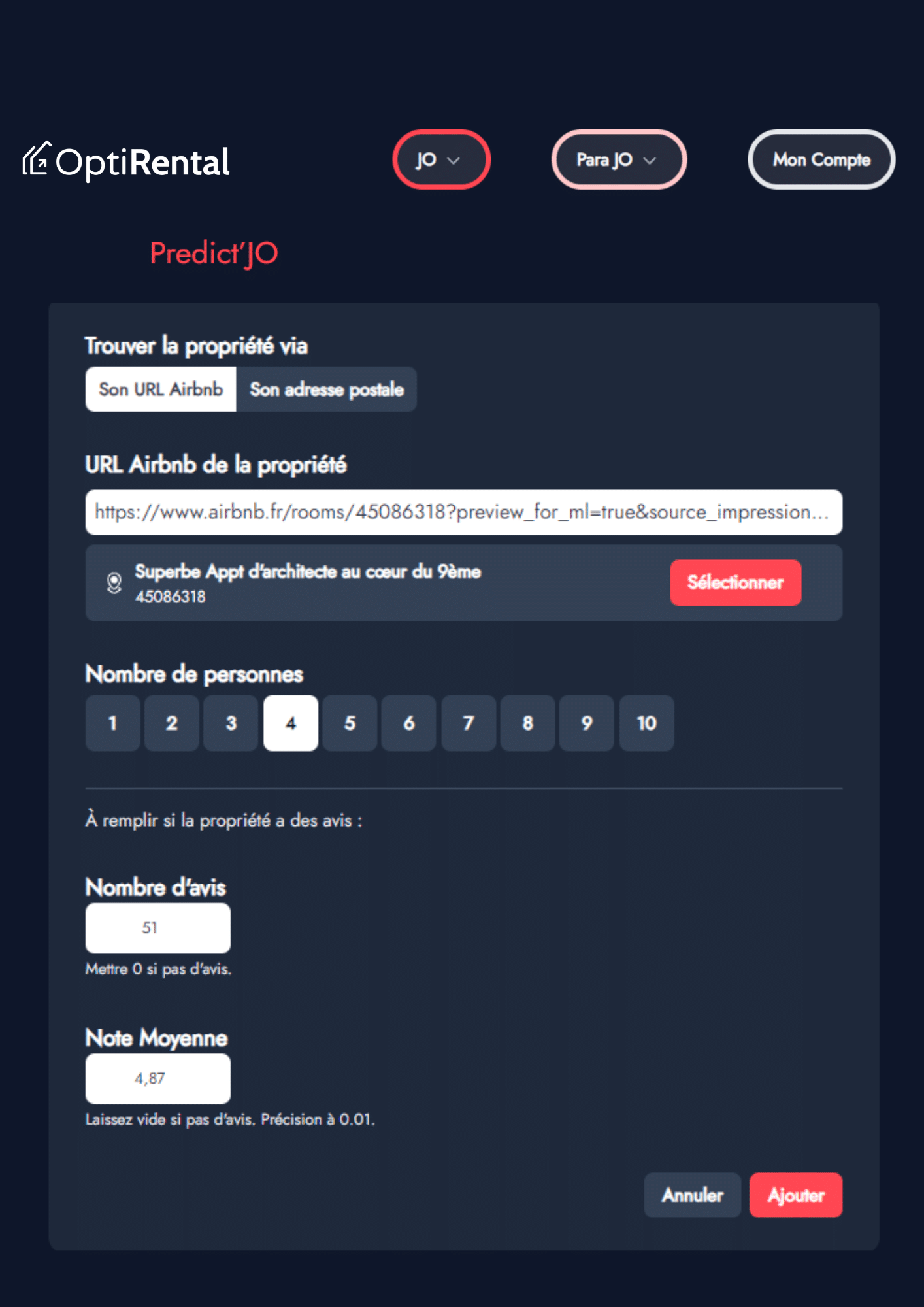 C'est dans ce contexte que le cabinet de conseil OptiRental lance Predict'JO. Il s'agit d'un outil automatique et personnalisé de tarification pour les séjours pendant les Jeux Olympiques et Paralympiques. Un service de tarification à destination des propriétaires et des gestionnaires ayant des annonces existantes sur les plateformes de location (comme Airbnb ou Booking, pour ne citer qu'elles). Predict'JO peut également être utilisé par les personnes mettant pour la première fois leur logement en location courte durée.